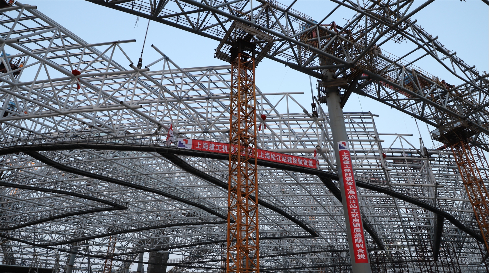 过程中,上海建工充分发挥集团全产业链优势,心怀“利他之心”,派驻具有“工程师气质”的菱形管控团队,坚持数字赋能管理,最终让蓝图变为施工图、实景画。钢屋盖在今天顺利合拢,离不开各方的关心支持和共同努力。上海建工将继续坚持服务国家战略,以“事不避难、迎难而上、追求卓越”的奋斗者精神,高效优质地完成后续幕墙、装饰、机电安装等工程建设任务,努力把上海松江站项目打造成为代表“上海品牌”的精品工程。